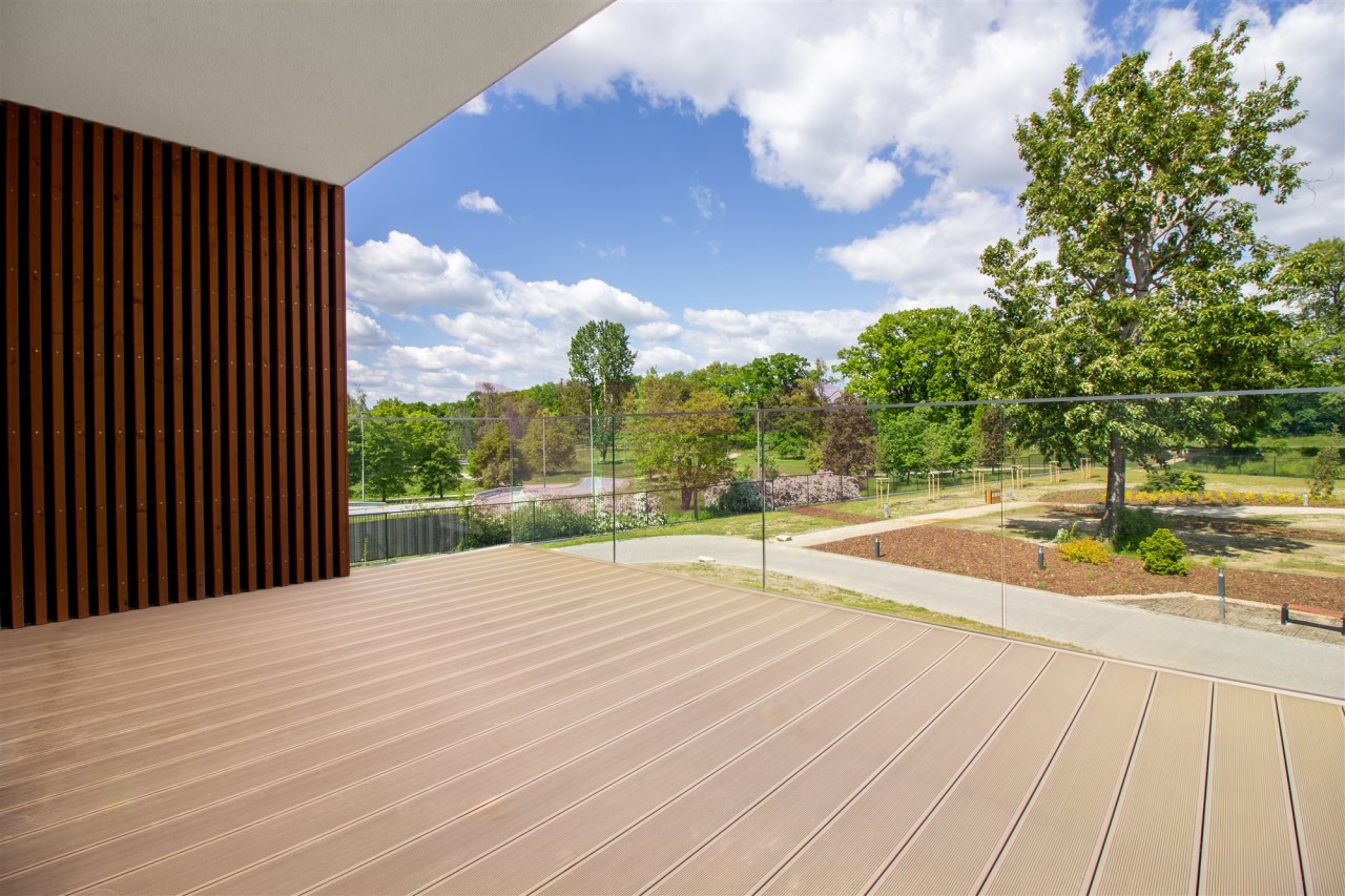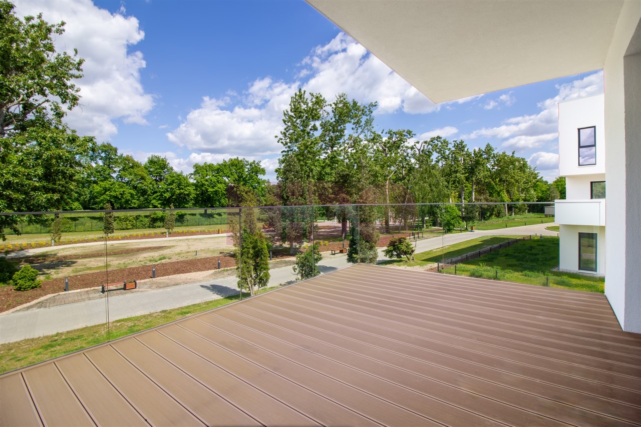 Z salonu roztacza się niezwykły widok na zieleń i w stronę rzeki Odry — mieszkanie znajduje się w pierwszym rzędzie zabudowy, co gwarantuje bezpośredni kontakt z naturą i brak sąsiednich okien „naprzeciw”.
