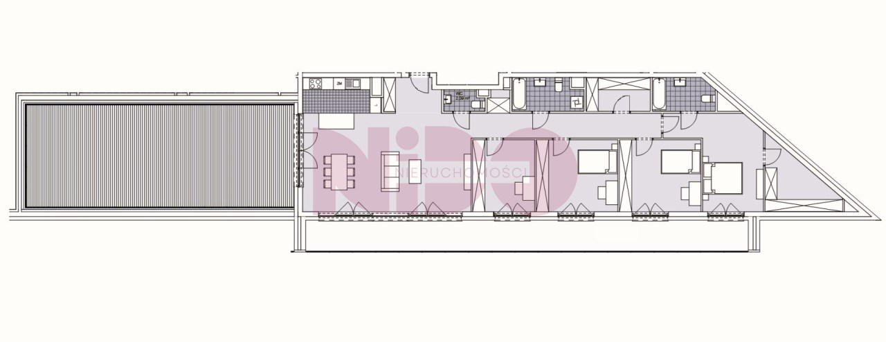 - na długość mieszkania loggia z wyjściem z każdego pokoju