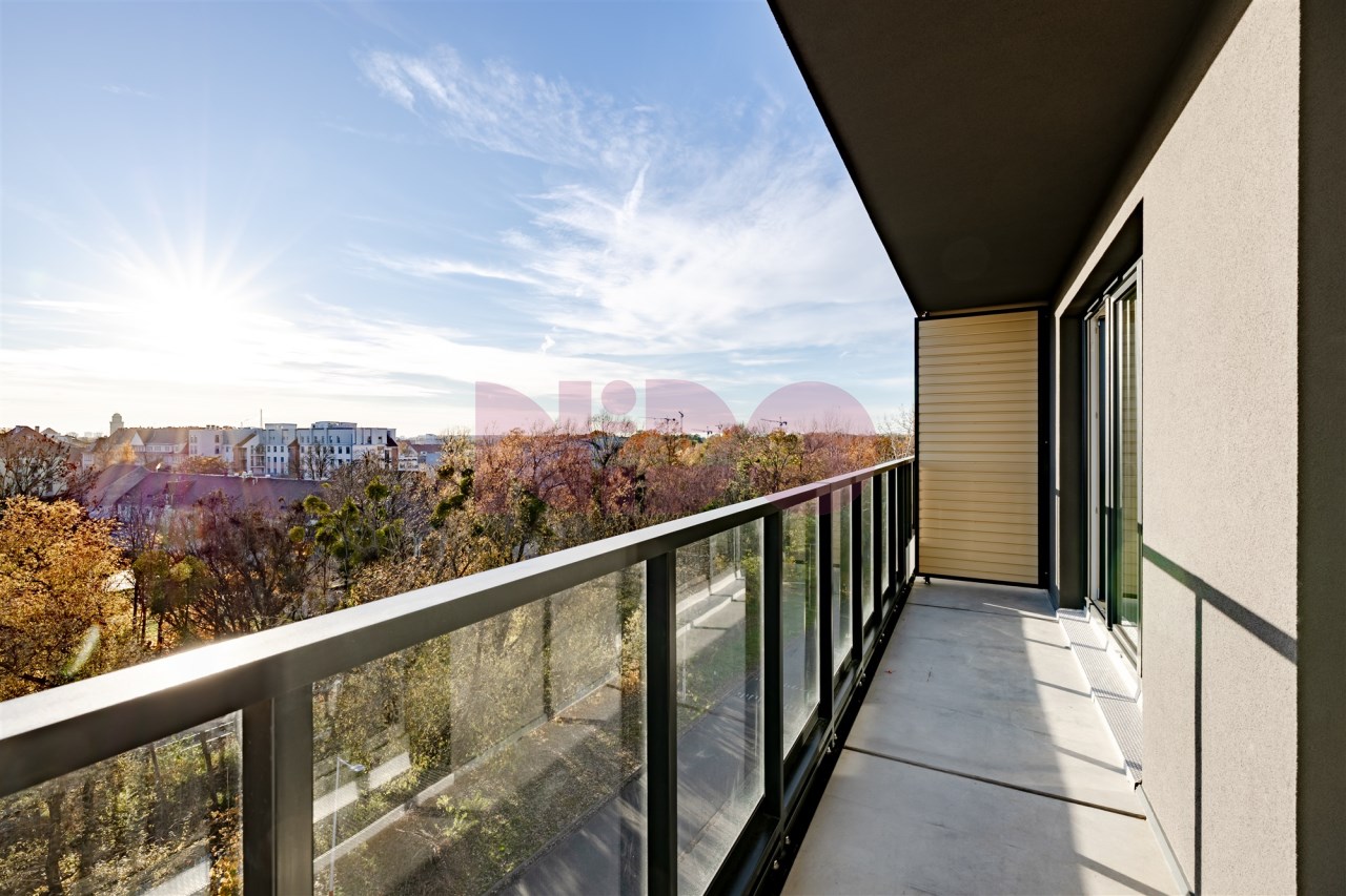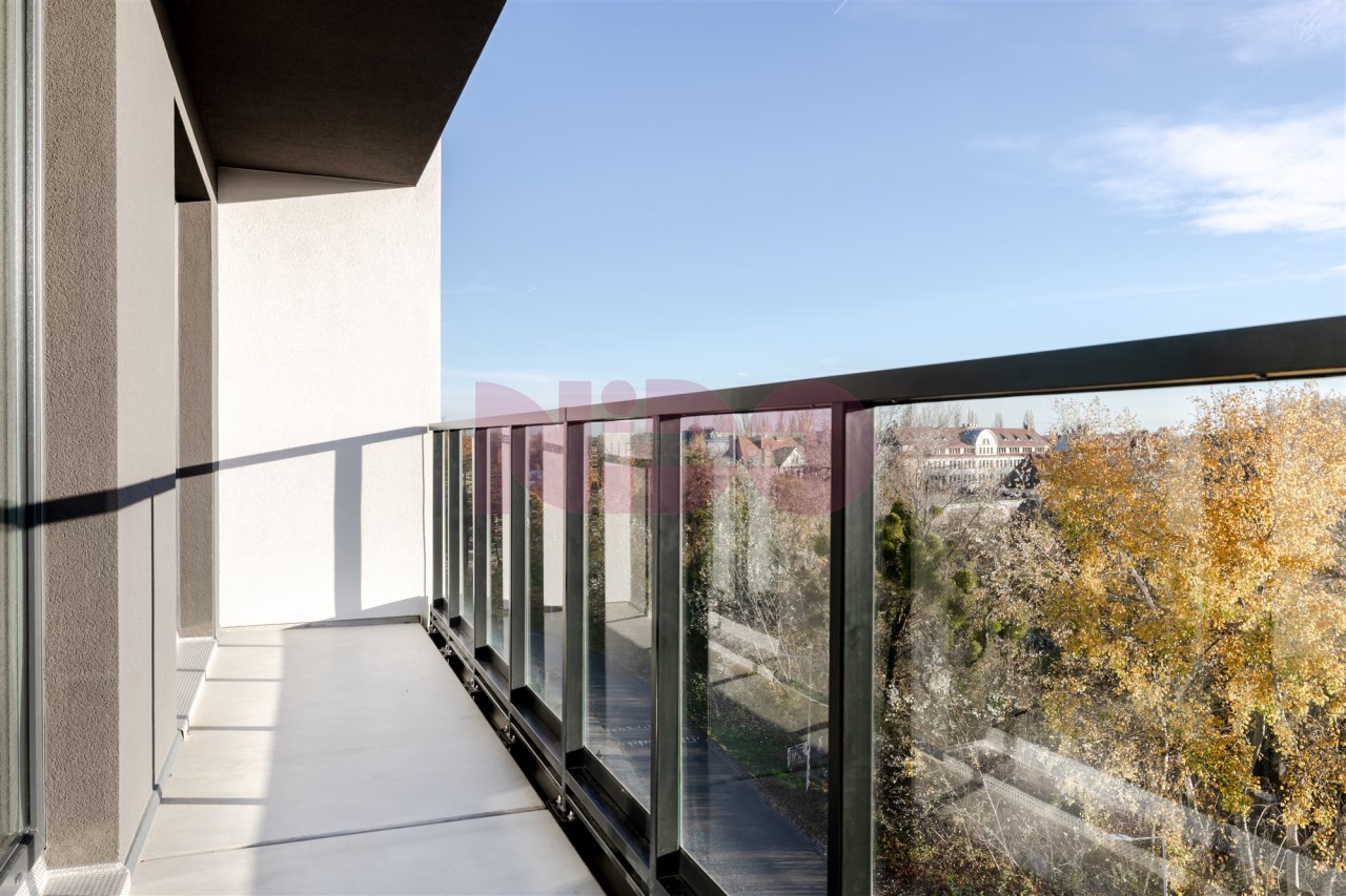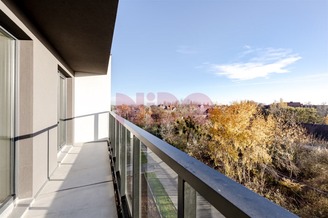 Balkon ma prawie 7 m² i prowadzi na niego wyjście zarówno z salonu, jak i z sypialni.