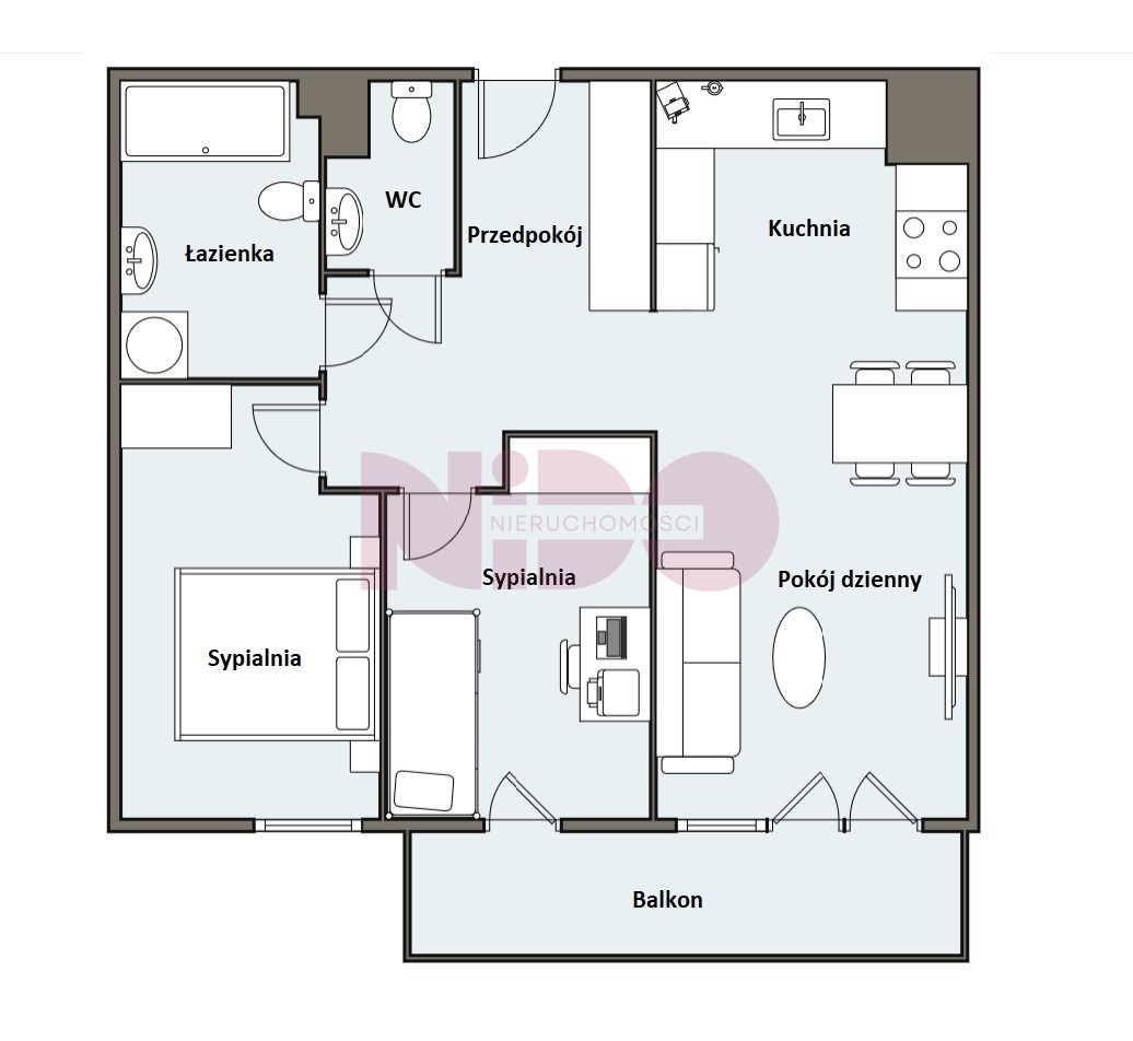 - duży balkon na długość całego mieszkania z wyjściem z każdego pokoju